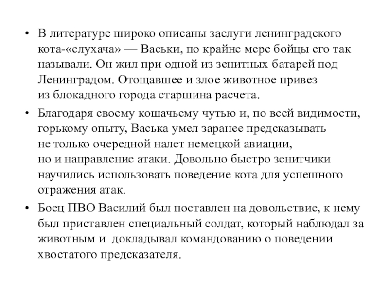 Слайд 17В литературе широко описаны заслуги ленинградского кота-«слухача» — Васьки, по