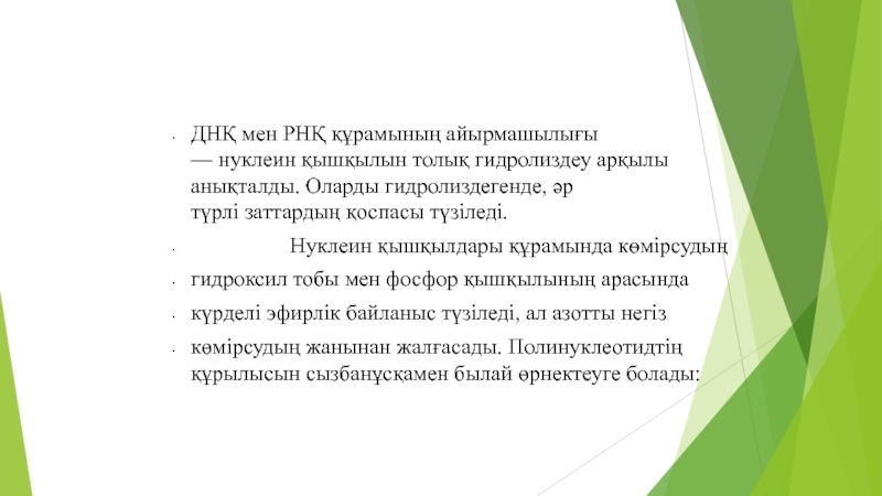 Слайд 9ДНҚ мен РНҚ құрамының айырмашылығы — нуклеин қышқылын толық гидролиздеу арқылы анықталды. Оларды гидролиздегенде, әр түрлі заттардың қоспасы түзіледі.