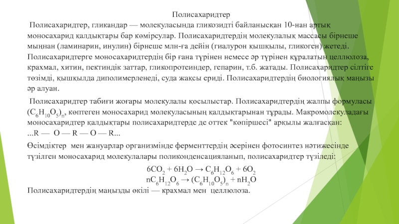 Полисахаридтер табиғи жоғары молекулалы қосылыстар. Полисахаридтердің жалпы формуласы (С6Н10О5)n, көптеген моносахарид молекуласының қалдықтарынан тұрады. Макромолекуладағы моносахаридтер қалдықтары полисахаридтерде де оттек "көпіршесі" арқылы жалғасқан: