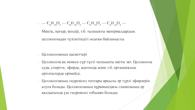 Целлюлозаның макромолекуласы циклді (3- глюкозаның қалдықтарынан тұрады, түзу құрылымды . Целлюлозаның макромолекулалары бір бағытта орналасқандықтан, талшық түзеді (зығыр, мақта, кендір, т.б.).