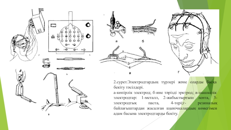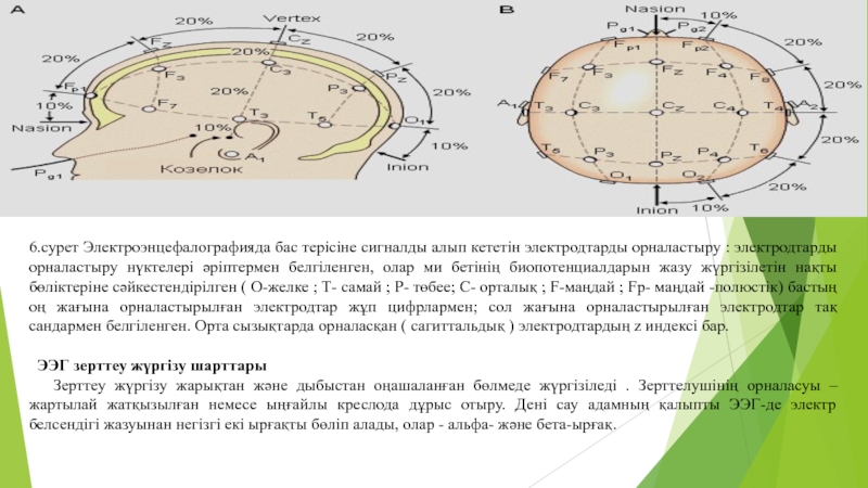 Слайд 166.сурет Электроэнцефалографияда бас терісіне сигналды алып кететін электродтарды орналастыру :