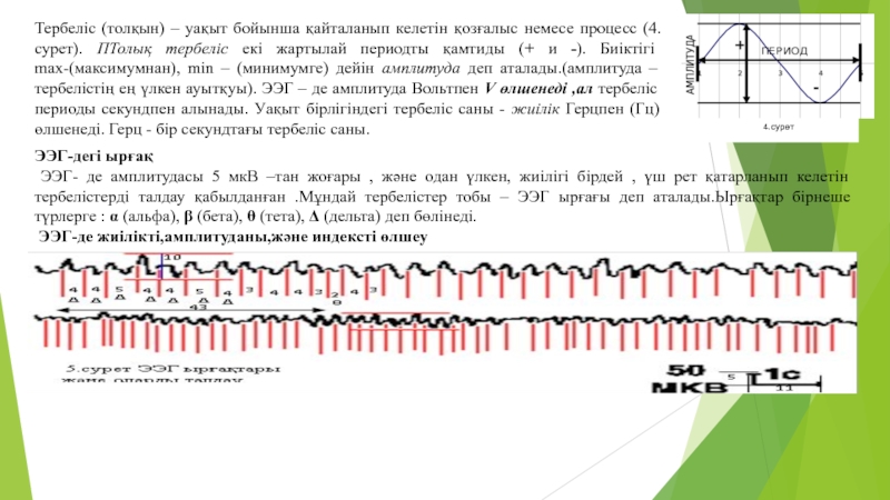 Биіктігі max-(максимумнан), min – (минимумге) дейін амплитуда деп аталады.(амплитуда – тербелістің ең үлкен ауытқуы). ЭЭГ – де амплитуда Вольтпен V өлшенеді ,ал тербеліс периоды секундпен алынады. Уақыт бірлігіндегі тербеліс саны - жиілік Герцпен (Гц) өлшенеді. Герц - бір секундтағы тербеліс саны.