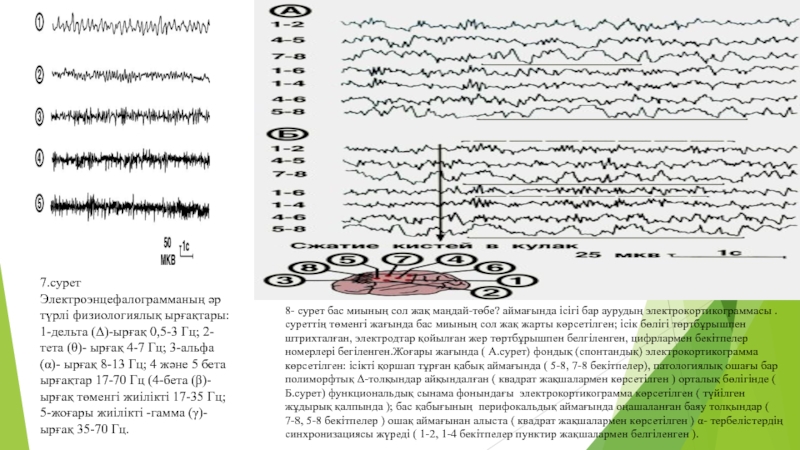 Слайд 187.сурет Электроэнцефалограмманың әр түрлі физиологиялық ырғақтары: 1-дельта (Δ)-ырғақ 0,5-3 Гц;