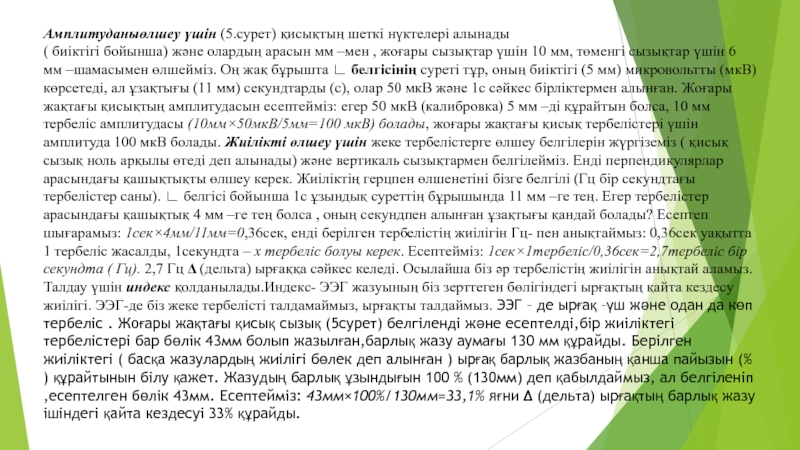 мм, төменгі сызықтар үшін 6 мм –шамасымен өлшейміз. Оң жақ бұрышта ∟ белгісінің суреті тұр, оның биіктігі (5 мм) микровольтты (мкВ) көрсетеді, ал ұзақтығы (11 мм) секундтарды (с), олар 50 мкВ және 1с сәйкес бірліктермен алынған. Жоғары жақтағы қисықтың амплитудасын есептейміз: егер 50 мкВ (калибровка) 5 мм –ді құрайтын болса, 10 мм тербеліс амплитудасы (10мм×50мкВ/5мм=100 мкВ) болады, жоғары жақтағы қисық тербелістері үшін амплитуда 100 мкВ болады. Жиілікті өлшеу үшін жеке тербелістерге өлшеу белгілерін жүргіземіз ( қисық сызық ноль арқылы өтеді деп алынады) және вертикаль сызықтармен белгілейміз. Енді перпендикулярлар арасындағы қашықтықты өлшеу керек. Жиіліктің герцпен өлшенетіні бізге белгілі (Гц бір секундтағы тербелістер саны). ∟ белгісі бойынша 1с ұзындық суреттің бұрышында 11 мм –ге тең. Егер тербелістер арасындағы қашықтық 4 мм –ге тең болса , оның секундпен алынған ұзақтығы қандай болады? Есептеп шығарамыз: 1сек×4мм/11мм=0,36сек, енді берілген тербелістің жиілігін Гц- пен анықтаймыз: 0,36сек уақытта 1 тербеліс жасалды, 1секундта – х тербеліс болуы керек. Есептейміз: 1сек×1тербеліс/0,36сек=2,7тербеліс бір секундта ( Гц). 2,7 Гц Δ (дельта) ырғаққа сәйкес келеді. Осылайша біз әр тербелістің жиілігін анықтай аламыз. Талдау үшін индекс қолданылады.Индекс- ЭЭГ жазуының біз зерттеген бөлігіндегі ырғақтың қайта кездесу жиілігі. ЭЭГ-де біз жеке тербелісті талдамаймыз, ырғақты талдаймыз. ЭЭГ – де ырғақ –үш және одан да көп тербеліс . Жоғары жақтағы қисық сызық (5сурет) белгіленді және есептелді,бір жиіліктегі тербелістері бар бөлік 43мм болып жазылған,барлық жазу аумағы 130 мм құрайды. Берілген жиіліктегі ( басқа жазулардың жиілігі бөлек деп алынған ) ырғақ барлық жазбаның қанша пайызын (% ) құрайтынын білу қажет. Жазудың барлық ұзындығын 100 % (130мм) деп қабылдаймыз, ал белгіленіп ,есептелген бөлік 43мм. Есептейміз: 43мм×100%/130мм=33,1% яғни Δ (дельта) ырғақтың барлық жазу ішіндегі қайта кездесуі 33% құрайды.