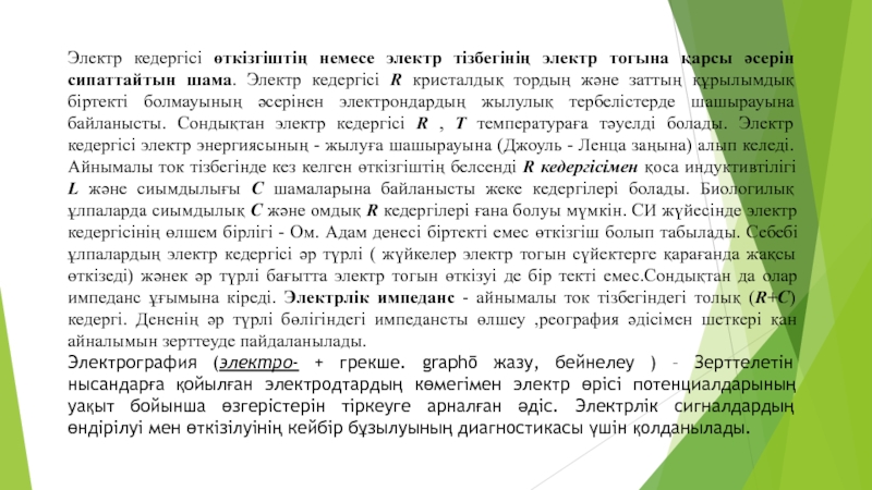 Слайд 7Электр кедергісі өткізгіштің немесе электр тізбегінің электр тогына қарсы әсерін