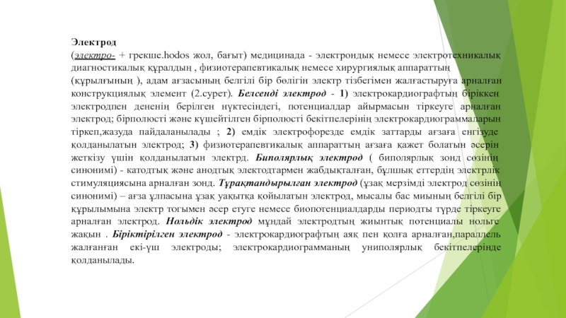 белгілі бір бөлігін электр тізбегімен жалғастыруға арналған конструкциялық элемент (2.сурет). Белсенді электрод - 1) электрокардиографтың біріккен электродпен дененің берілген нүктесіндегі, потенциалдар айырмасын тіркеуге арналған электрод; бірполюсті және күшейтілген бірполюсті бекітпелерінің электрокардиограммаларын тіркеп,жазуда пайдаланылады ; 2) емдік электрофорезде емдік заттарды ағзаға енгізуде қолданылатын электрод; 3) физиотерапевтикалық аппараттың ағзаға қажет болатын әсерін жеткізу үшін қолданылатын электрд. Биполярлық электрод ( биполярлық зонд сөзінің синонимі) - катодтық және анодтық электодтармен жабдықталған, бұлшық еттердің электрлік стимуляциясына арналған зонд. Тұрақтандырылған электрод (ұзақ мерзімді электрод сөзінің синонимі) – ағза ұлпасына ұзақ уақытқа қойылатын электрод, мысалы бас миының белгілі бір құрылымына электр тогымен әсер етуге немесе биопотенциалдарды периодты түрде тіркеуге арналған электрод. Нольдік электрод мұндай электродтың жиынтық потенциалы нольге жақын . Біріктірілген электрод - электрокардиографтың аяқ пен қолға арналған,параллель жалғанған екі-үш электроды; электрокардиограмманың униполярлық бекітпелерінде қолданылады.