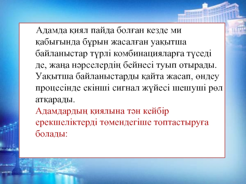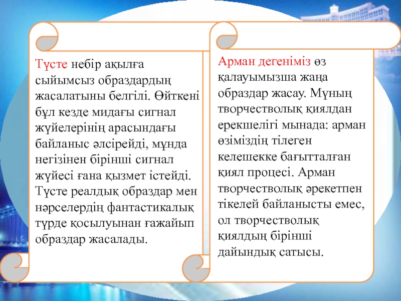 Түсте небір ақылға сыйымсыз образдардың жасалатыны белгілі. Өйткені бұл кезде мидағы сигнал жүйелерінің арасындағы байланыс әлсірейді, мұнда негізінен бірінші сигнал жүйесі ғана қызмет істейді.