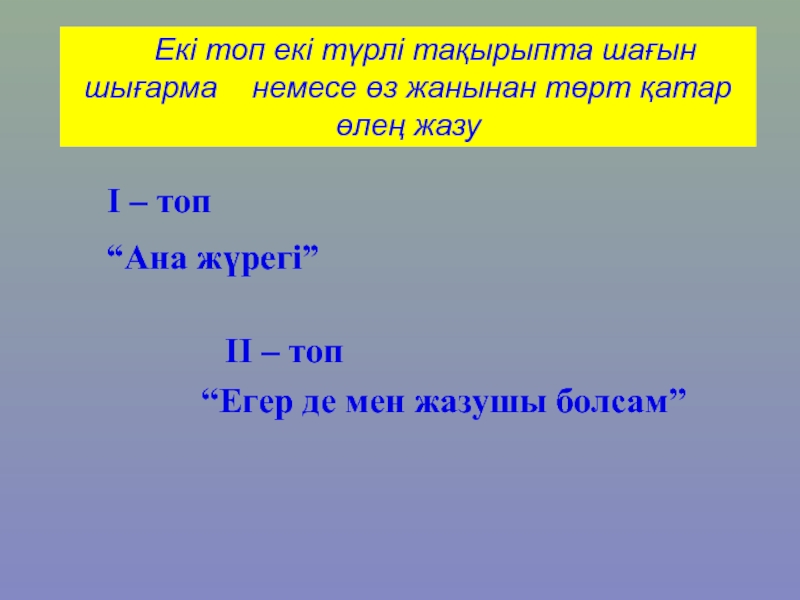 Слайд 18 Екі топ екі түрлі тақырыпта шағын шығарма