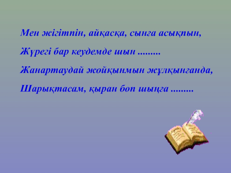 Слайд 15Мен жігітпін, айқасқа, сынға асықпын,