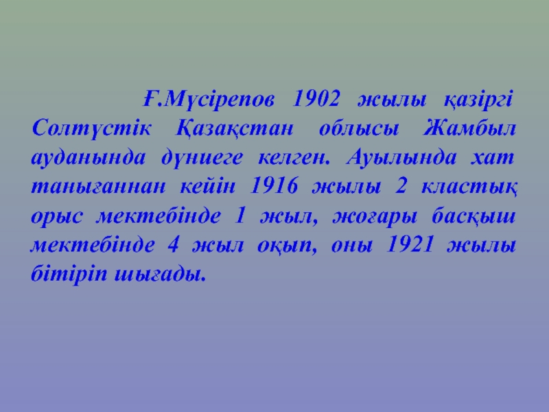 Слайд 9 Ғ.Мүсірепов 1902 жылы қазіргі Солтүстік Қазақстан