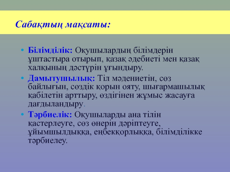 Сабақтың мақсаты: Білімділік: Оқушылардың білімдерін ұштастыра отырып, қазақ әдебиеті мен қазақ халқының дәстүрін ұғындыру.Дамытушылық: