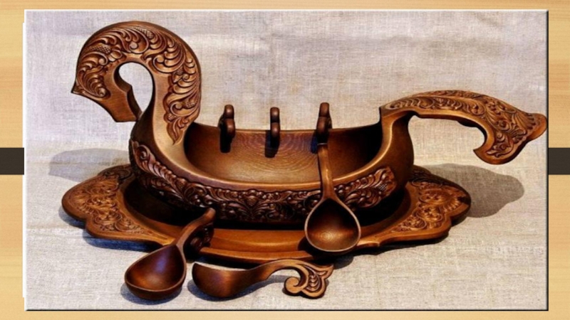 19 века.Ритмичный растительный орнамент можно увидеть на предметах быта того времени. Это ковши и солонки, декоративные шкатулки и вазы, большие тарелки. Помимо красивой резьбы, предметы, сделанные руками мастеров, отличаются тонировками, которые призваны подчеркнуть природную красоту древесины. Узоры покрывают всю поверхность поделки полностью, соединяя крупные детали между собой завитушками, веточками и другими растительными элементами.