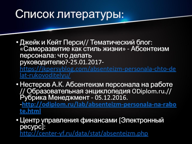 персонала на работе // Образовательная энциклопедия ODiplom.ru.// Рубрика Менеджмент - 05.12.2016. -http://odiplom.ru/lab/absenteizm-personala-na-rabote.html