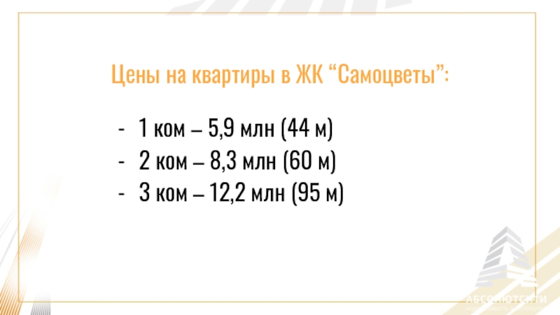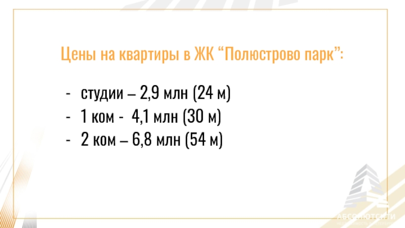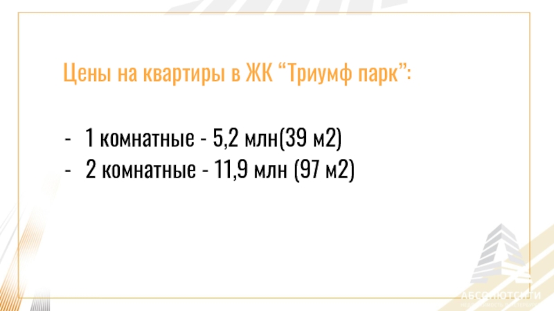 Слайд 11 Цены на квартиры в ЖК “Триумф парк”: