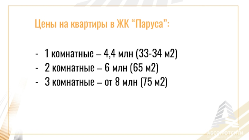 Слайд 14 Цены на квартиры в ЖК “Паруса”: