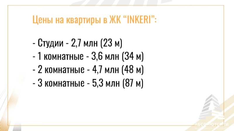 Слайд 7Цены на квартиры в ЖК “INKERI”: