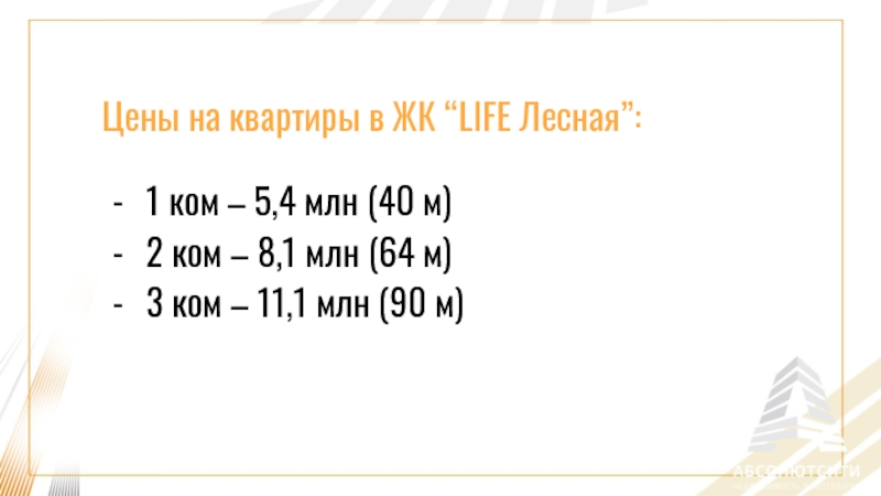 Слайд 36Цены на квартиры в ЖК “LIFE Лесная”: