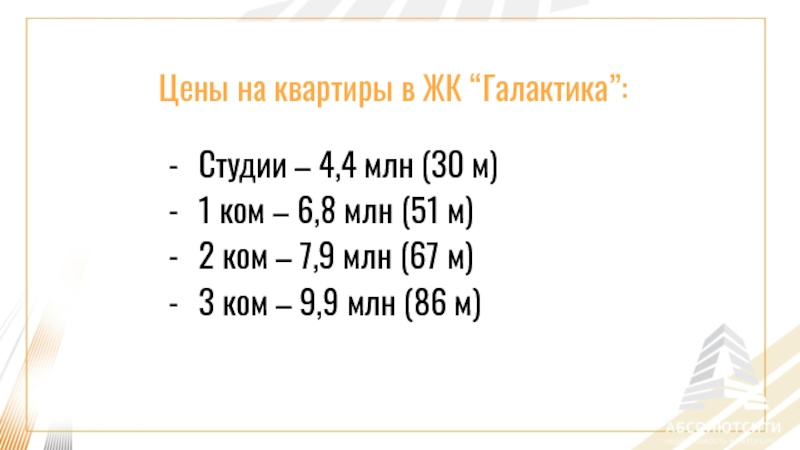 Слайд 31Цены на квартиры в ЖК “Галактика”:
