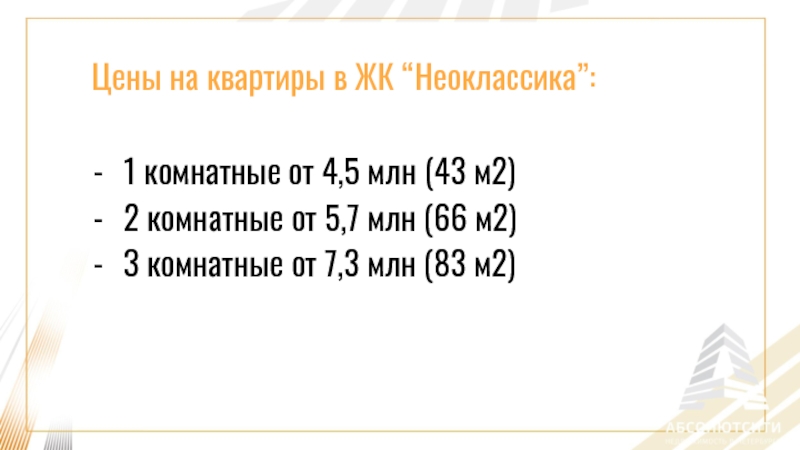 Слайд 9 Цены на квартиры в ЖК “Неоклассика”: