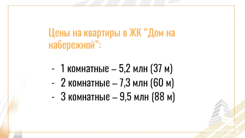 Слайд 26Цены на квартиры в ЖК “Дом на набережной”: