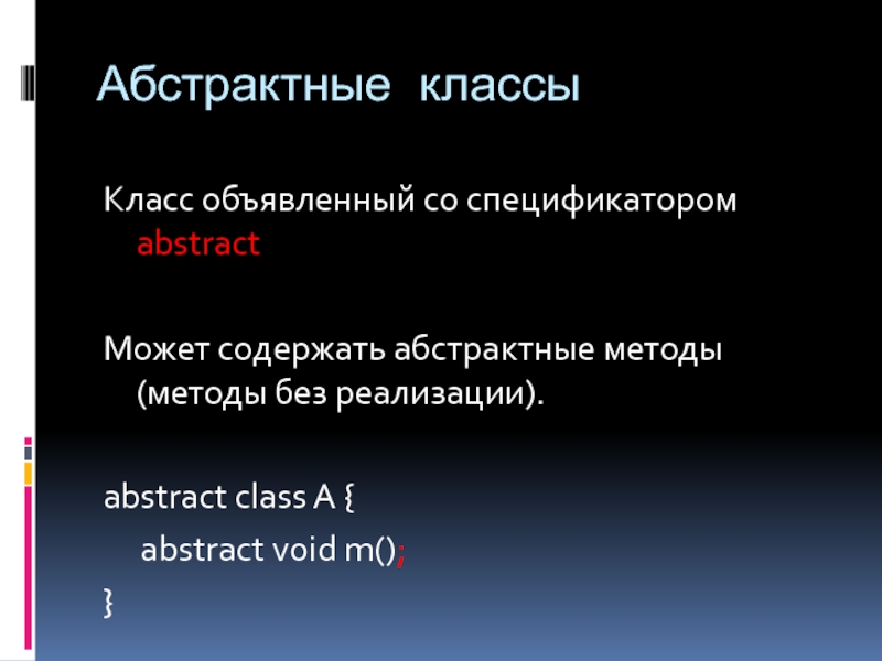 Абстрактные классыКласс объявленный со спецификатором abstractМожет содержать абстрактные методы (методы без реализации).abstract class A { abstract void m();}