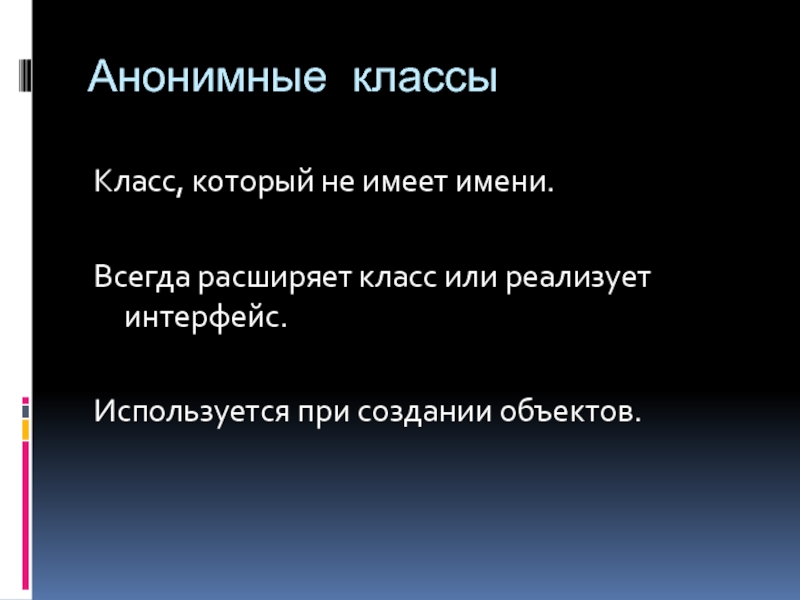 Анонимные классыКласс, который не имеет имени.Всегда расширяет класс или реализует интерфейс.Используется при создании объектов.