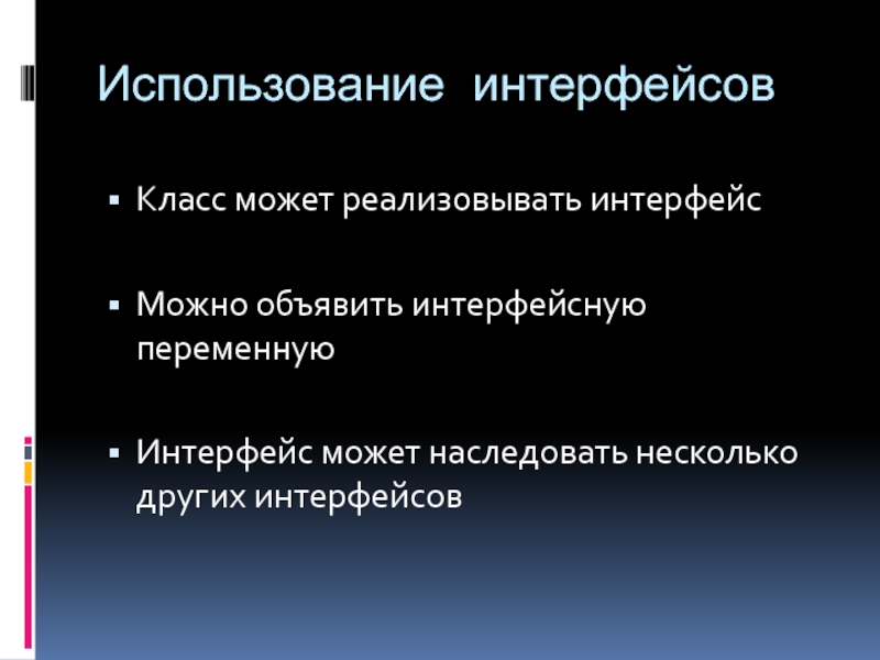 Использование интерфейсовКласс может реализовывать интерфейсМожно объявить интерфейсную переменнуюИнтерфейс может наследовать несколько других интерфейсов