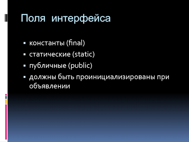 Поля интерфейсаконстанты (final)статические (static)публичные (public)должны быть проинициализированы при объявлении