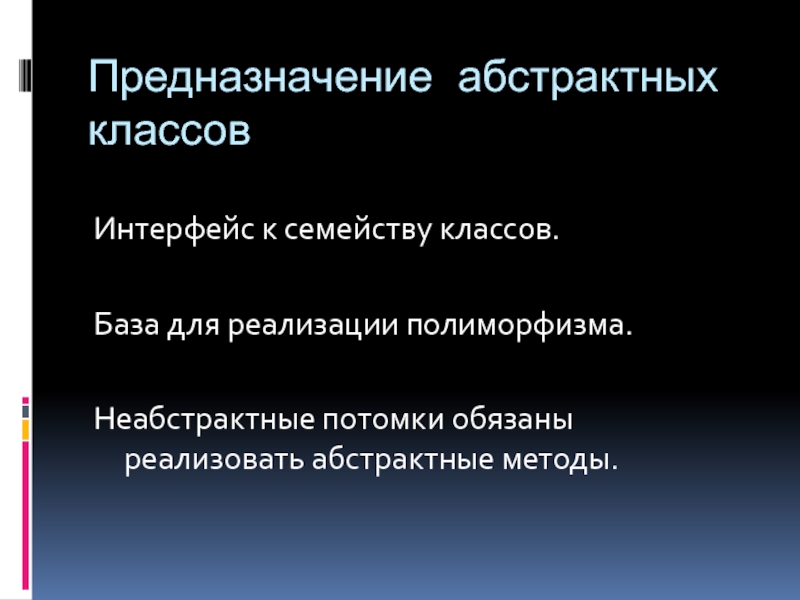 Предназначение абстрактных классовИнтерфейс к семейству классов.База для реализации полиморфизма.Неабстрактные потомки обязаны реализовать абстрактные методы.