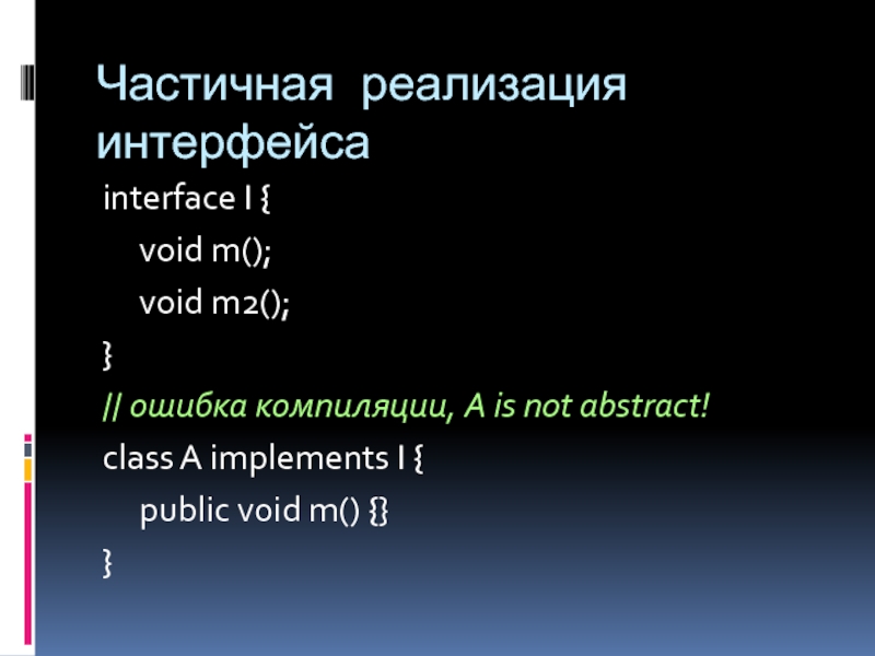 Частичная реализация интерфейсаinterface I {	void m();	void m2();}// ошибка компиляции, A is not abstract!class A implements I {	public