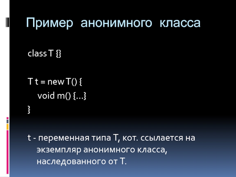 Пример анонимного классаclass T {}T t = new T() {	void m() {...}}t - переменная типа T, кот.
