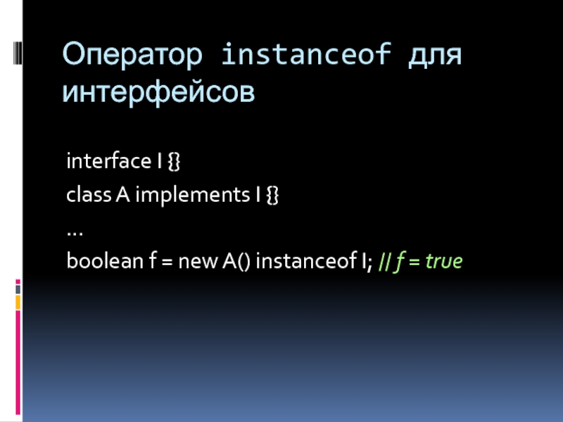 Оператор instanceof для интерфейсовinterface I {}class A implements I {}...boolean f = new A() instanceof I; //