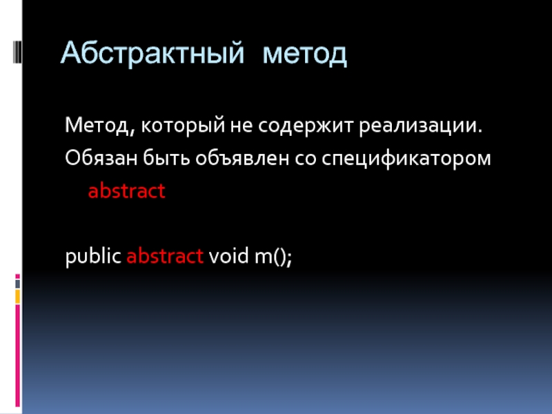 Абстрактный методМетод, который не содержит реализации.Обязан быть объявлен со спецификатором	abstractpublic abstract void m();