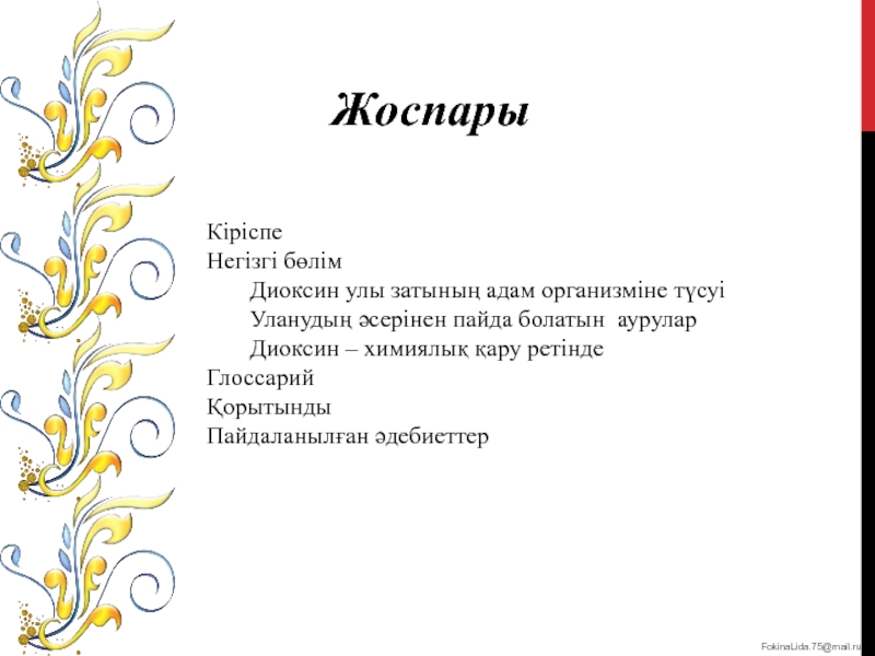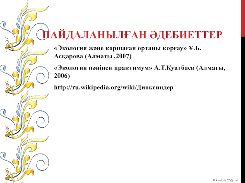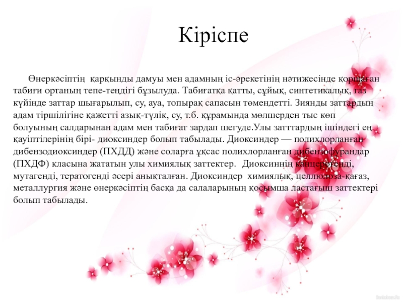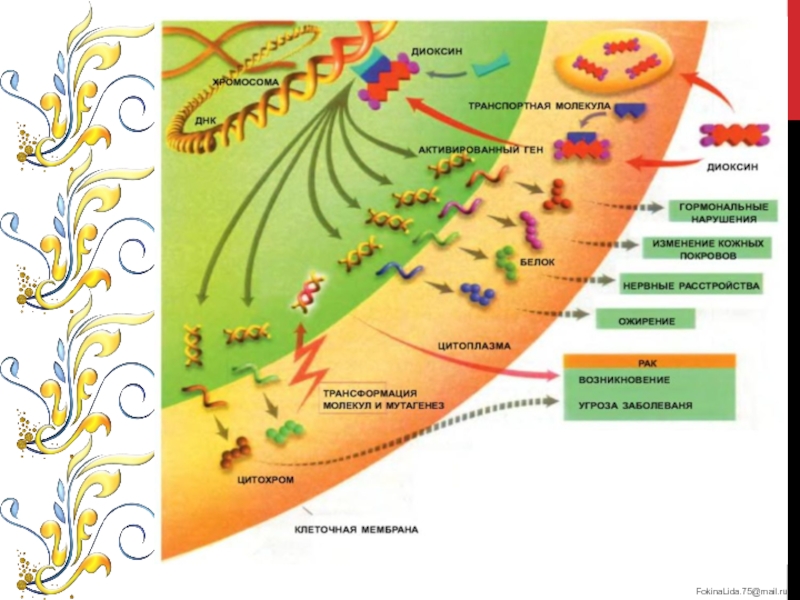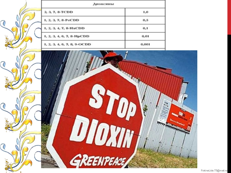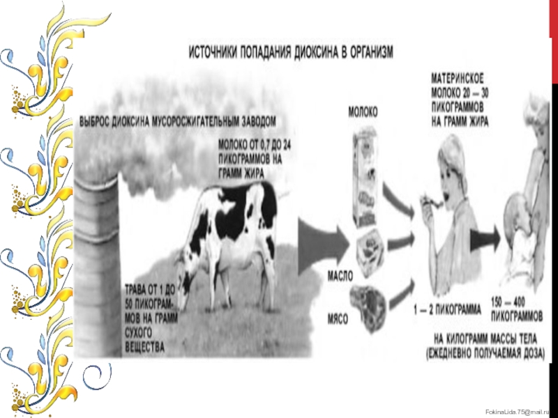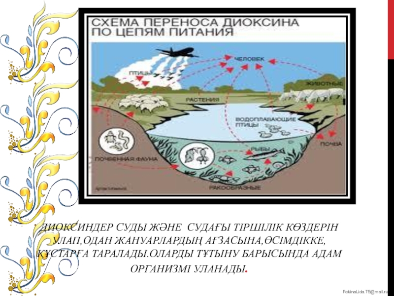 Слайд 5Диоксиндер суды және судағы тіршілік көздерін улап,одан жануарлардың ағзасына,өсімдікке,