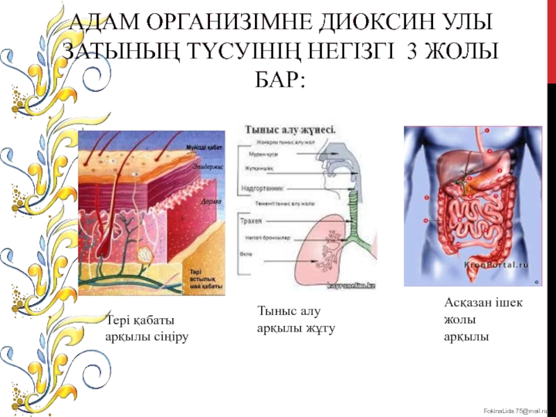 Слайд 8Адам организімне диоксин улы затының түсуінің негізгі 3 жолы бар: