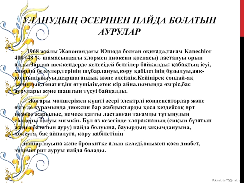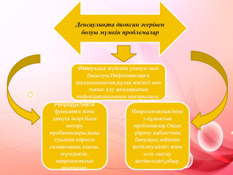 Слайд 11Денсаулықта диоксин әсерінен болуы мүмкін проблемалар