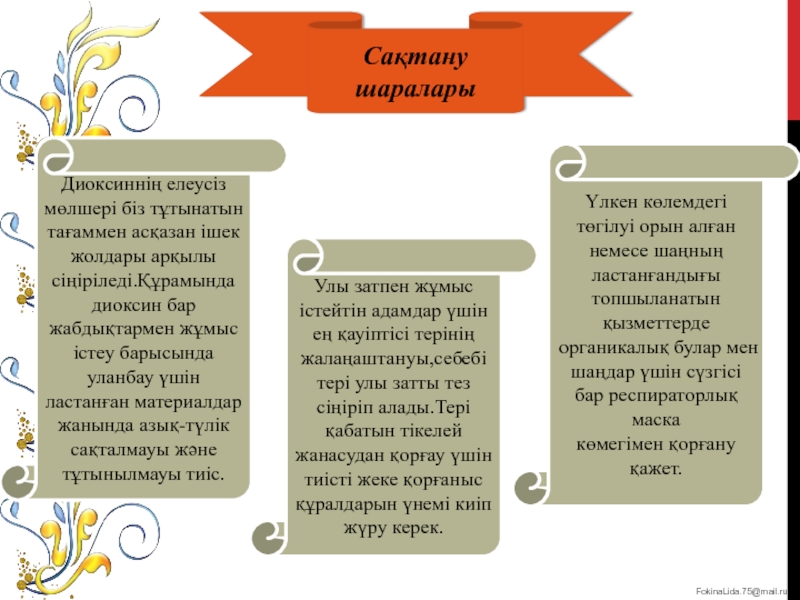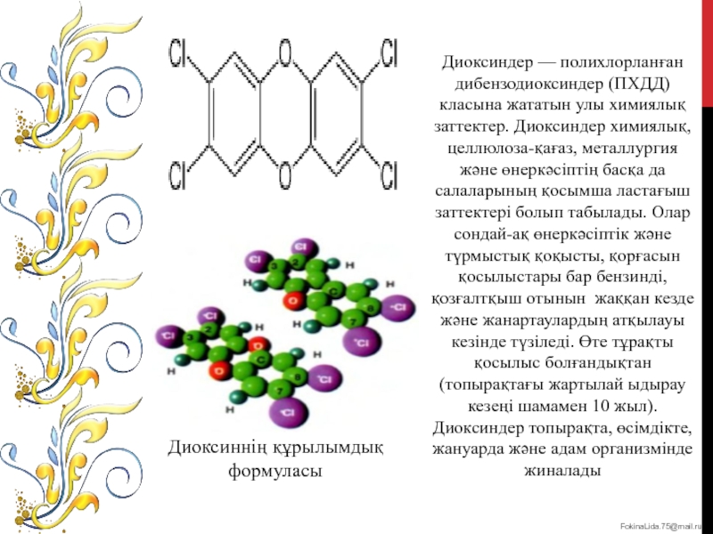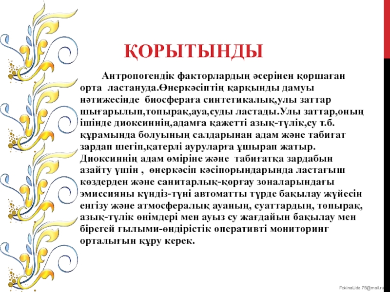 күйінде заттар шығарылып, су, ауа, топырақ сапасын төмендетті. Зиянды заттардың адам тіршілігіне қажетті азық-түлік, су, т.б. құрамында мөлшерден тыс көп болуының салдарынан адам мен табиғат зардап шегуде.Улы затттардың ішіндегі ең қауіптілерінің бірі- диоксиндер болып табылады. Диоксиндер — полихлорланған дибензодиоксиндер (ПХДД) және соларға ұқсас полихлорланған дибензофурандар (ПХДФ) класына жататын улы химиялық заттектер. Диоксиннің канцерогенді, мутагенді, тератогенді әсері анықталған. Диоксиндер химиялық, целлюлоза-қағаз, металлургия және өнеркәсіптің басқа да салаларының қосымша ластағыш заттектері болып табылады.