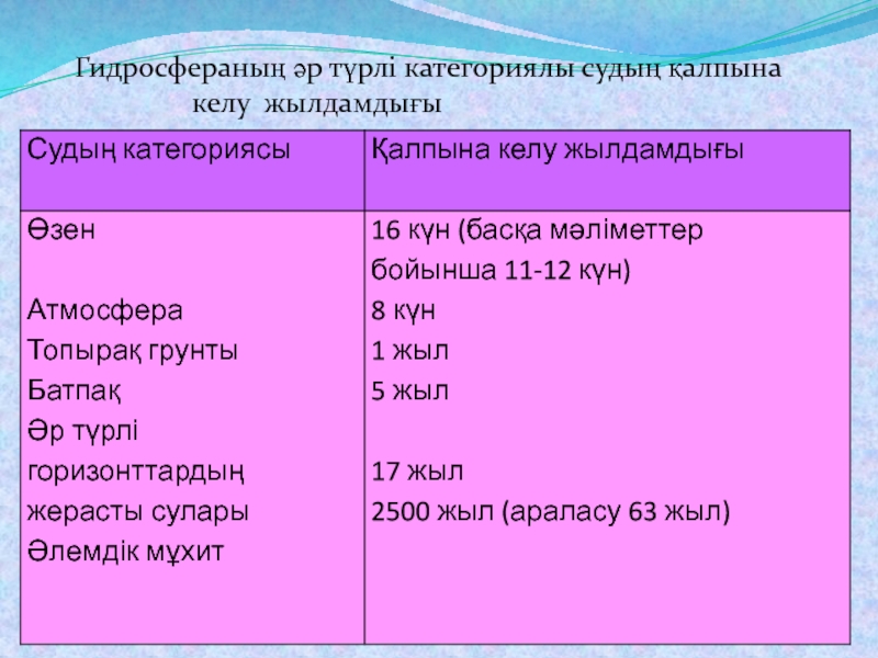 Слайд 11 Гидросфераның әр түрлі категориялы судың қалпына келу жылдамдығы