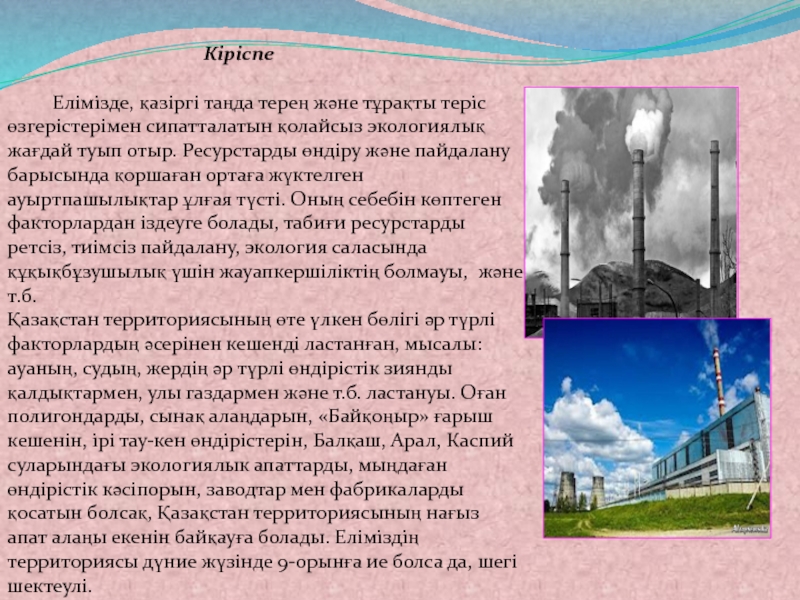 Елімізде, қазіргі таңда терең және тұрақты теріс өзгерістерімен сипатталатын қолайсыз экологиялық жағдай туып отыр. Ресурстарды өндіру және пайдалану барысында қоршаған ортаға жүктелген ауыртпашылықтар ұлғая түсті. Оның себебін көптеген факторлардан іздеуге болады, табиғи ресурстарды ретсіз, тиімсіз пайдалану, экология саласында құқықбұзушылық үшін жауапкершіліктің болмауы, және т.б. Қазақстан территориясының өте үлкен бөлігі әр түрлі факторлардың әсерінен кешенді ластанған, мысалы: ауаның, судың, жердің әр түрлі өндірістік зиянды қалдықтармен, улы газдармен және т.б. ластануы. Оған полигондарды, сынақ алаңдарын, «Байқоңыр» ғарыш кешенін, ірі тау-кен өндірістерін, Балқаш, Арал, Каспий суларындағы экологиялык апаттарды, мыңдаған өндірістік кәсіпорын, заводтар мен фабрикаларды қосатын болсақ, Қазақстан территориясының нағыз апат алаңы екенін байқауға болады. Еліміздің территориясы дүние жүзінде 9-орынға ие болса да, шегі шектеулі.