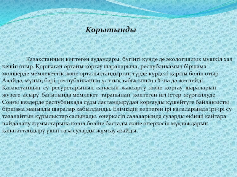 Қазақстанның көптеген аудандары, бүгінгі күнде де экологиялық мүшкіл хал кешіп отыр. Қоршаған ортаны қорғау шараларына, республикамыз біршама мөлшерде мемлекеттік және орталықтандырған түрде күрделі қаржы бөліп отыр. Алайда, мұның бәрі, республиканың ұлттық табысының 1%-на да жетпейді.Қазақстанның су ресурстарының сапасын жақсарту және қорғау шараларын жүзеге асыру бағытында мемлекет тарапынан көптеген игі істер жүргізілуде. Соңғы кездерде республикада суды ластандырудан қорғауды күшейтуге байланысты біршама маңызды шаралар қабылданды. Еліміздің көптеген ірі қалаларында ірі-ірі су тазалайтын құрылыстар салынады. өнеркәсіп салаларында суларды екінші қайтара пайдалану жұмыстарына көңіл бөліне бастады және өнеркәсіп мұқтаждарын қанағаттандыру үшін таза суларды жұмсау азайды.