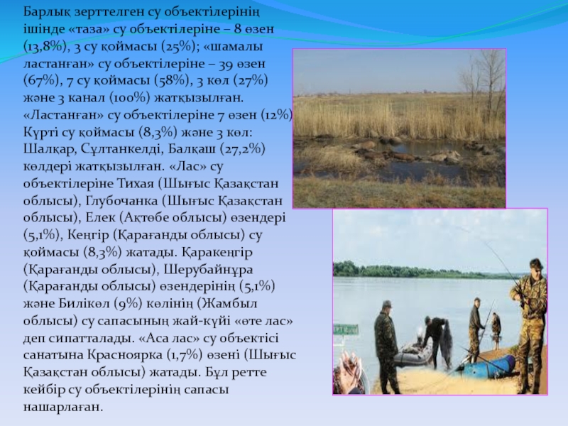 өзен (13,8%), 3 су қоймасы (25%); «шамалы ластанған» су объектілеріне