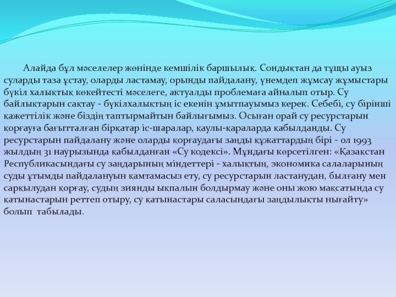 пайдалану, үнемдеп жұмсау жұмыстары бүкіл халықтық көкейтесті мәселеге, актуалды проблемаға айналып отыр. Су байлықтарын сақтау - бүкілхалықтың іс екенін ұмытпауымыз керек. Себебі, су бірінші қажеттілік және біздің таптырмайтын байлығымыз. Осыған орай су ресурстарын қорғауға бағытталған бірқатар іс-шаралар, қаулы-қараларда қабылданды. Су ресурстарын пайдалану және оларды қорғаудағы заңды құжаттардың бірі - ол 1993 жылдың 31 наурызында қабылданған «Су кодексі». Мұндағы көрсетілген: «Қазақстан Республикасындағы су заңдарының міндеттері - халықтың, экономика салаларының суды ұтымды пайдалануын қамтамасыз ету, су ресурстарын ластанудан, былғану мен сарқылудан қорғау, судың зиянды ықпалын болдырмау және оны жою мақсатында су қатынастарын реттеп отыру, су қатынастары саласындағы заңдылықты нығайту» болып табылады.