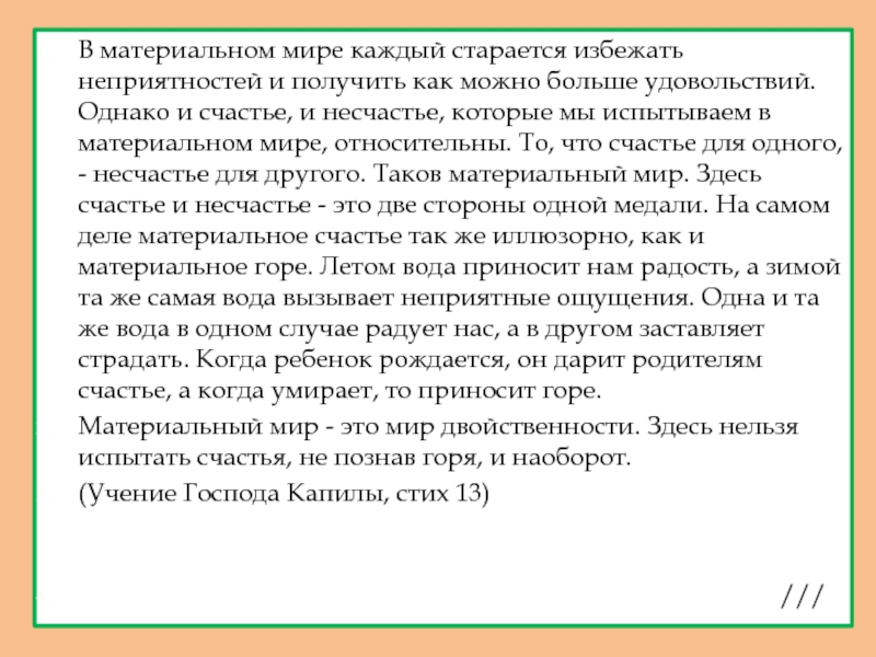 испытываем в материальном мире, относительны. То, что счастье для одного, - несчастье для другого. Таков материальный мир. Здесь счастье и несчастье - это две стороны одной медали. На самом деле материальное счастье так же иллюзорно, как и материальное горе. Летом вода приносит нам радость, а зимой та же самая вода вызывает неприятные ощущения. Одна и та же вода в одном случае радует нас, а в другом заставляет страдать. Когда ребенок рождается, он дарит родителям счастье, а когда умирает, то приносит горе.
