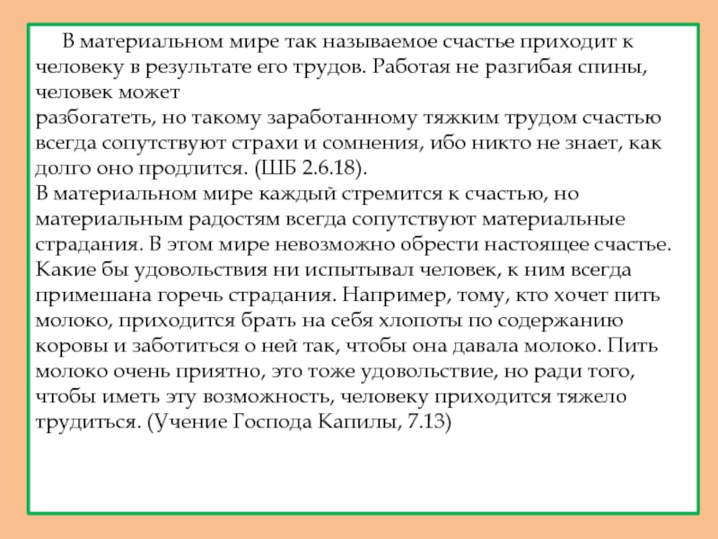 В материальном мире каждый стремится к счастью, но материальным радостям всегда сопутствуют материальные страдания. В этом мире невозможно обрести настоящее счастье. Какие бы удовольствия ни испытывал человек, к ним всегда примешана горечь страдания. Например, тому, кто хочет пить молоко, приходится брать на себя хлопоты по содержанию коровы и заботиться о ней так, чтобы она давала молоко. Пить молоко очень приятно, это тоже удовольствие, но ради того, чтобы иметь эту возможность, человеку приходится тяжело трудиться. (Учение Господа Капилы, 7.13)
