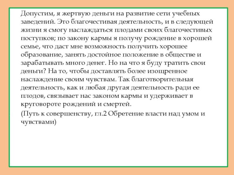 своих благочестивых поступков; по закону кармы я получу рождение в хорошей семье, что даст мне возможность получить хорошее образование, занять достойное положение в обществе и зарабатывать много денег. Но на что я буду тратить свои деньги? На то, чтобы доставлять более изощренное наслаждение своим чувствам. Так благотворительная деятельность, как и любая другая деятельность ради ее плодов, связывает нас законом кармы и удерживает в круговороте рождений и смертей.