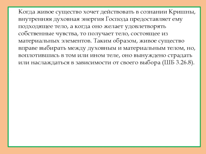 воплощаться в теле определенного типа, которое наделено определенными органами чувств и находится под влиянием определенного сочетания трех гун материальной природы. Она получает это тело не по собственному выбору. Иначе говоря, обусловленная душа лишена свободы выбора и вынуждена получать тело определенного типа в зависимости от своей кармы. Но, когда живое существо испытывает на себе последствия своей деятельности в форме радостей и страданий, их причиной