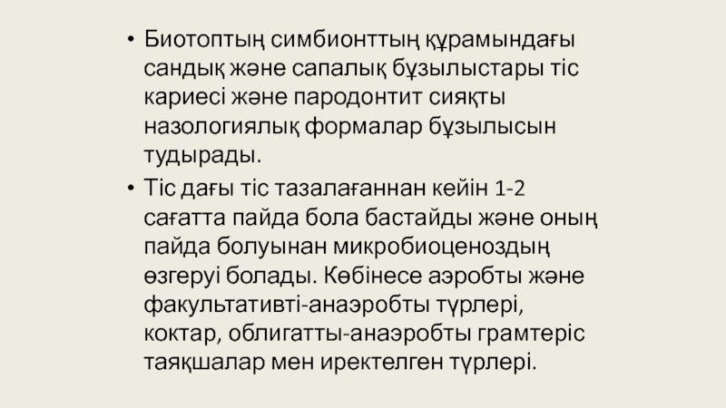 Слайд 26Биотоптың симбионттың құрамындағы сандық және сапалық бұзылыстары тіс кариесі және