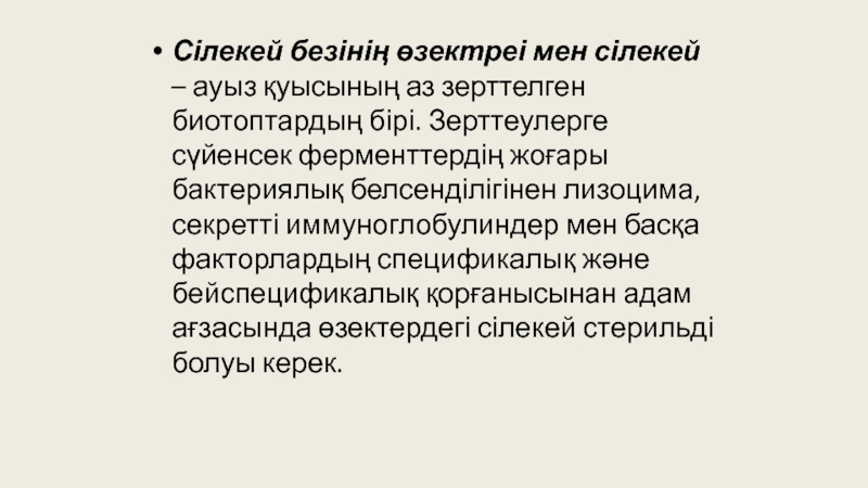 иммуноглобулиндер мен басқа факторлардың спецификалық және бейспецификалық қорғанысынан адам ағзасында өзектердегі сілекей стерильді болуы керек.