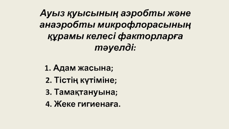 Слайд 19Ауыз қуысының аэробты және анаэробты микрофлорасының құрамы келесі факторларға тәуелді: