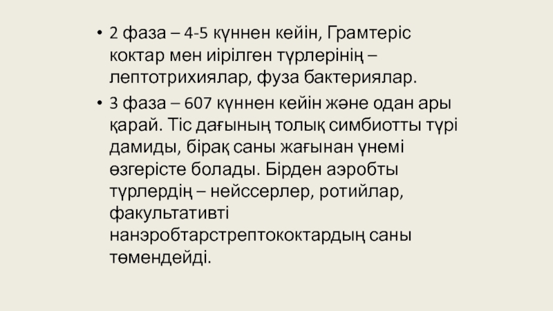 және одан ары қарай. Тіс дағының толық симбиотты түрі дамиды, бірақ саны жағынан үнемі өзгерісте болады. Бірден аэробты түрлердің – нейссерлер, ротийлар, факультативті нанэробтарстрептококтардың саны төмендейді.